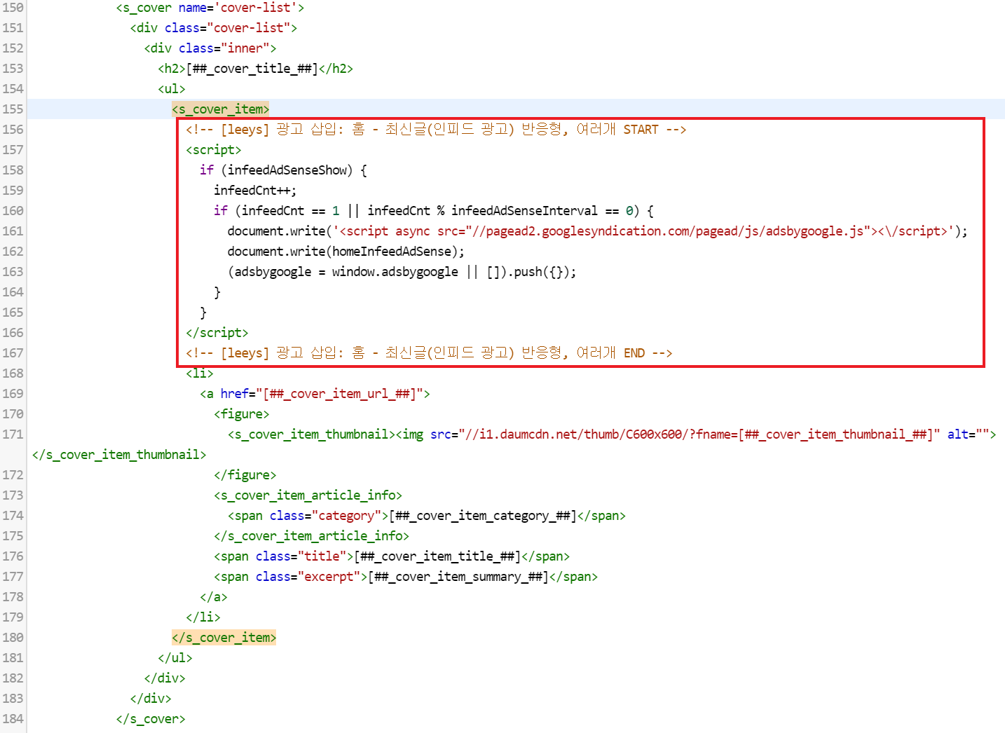 지금까지는 준비과정이고 이제 홈, 카테고리에 인피드 광고를 삽입할 위치를 찾아 아래 소스를 넣어주어야 합니다.